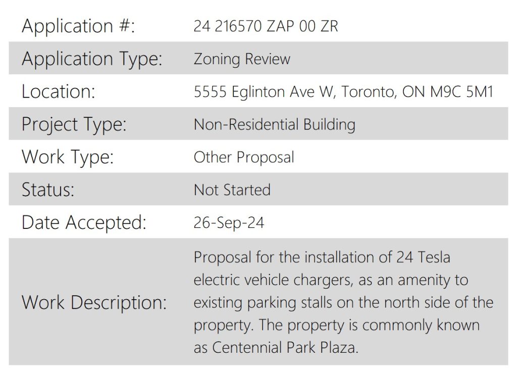 According to recently filed zoning permits uncovered by Marco on X, the company intends to build a 24-stall Supercharger at Centennial Park Plaza, located at 5555 Eglinton Ave W, just 7 kilometers from Toronto Pearson International Airport.
