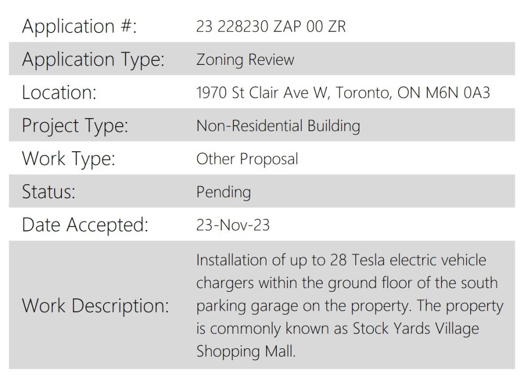 Zoning permits submitted late last year but only recently discovered by Supercharger sleuth Marco show that Tesla is intending to build a 28-stall Supercharger at 1970 St Clair Ave W. According to the permit description, this Supercharger will be installed on the “ground floor of the south parking garage” at the Stock Yards Village Shopping Mall.