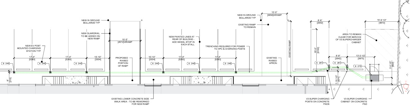 On the western side of the building Tesla will install 6 dual connector Destination Chargers, as well as two V3 Superchargers.
