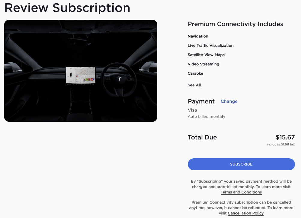 Late last year Tesla finally announced a Premium Connectivity Subscription for $9.99/month in the US. With that monthly fee, Tesla owners were able to retain access to certain features in the car like live traffic visualization, music streaming, and more.