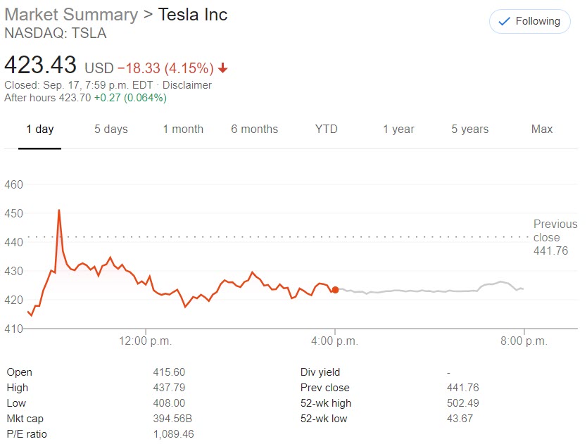 Tesla shares Sept 17 2020