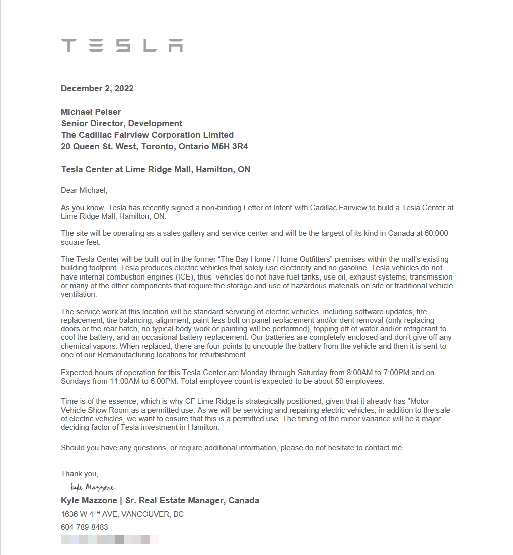 Here is the full letter from Tesla Canada’s Sr. Real Estate Manager Kyle Mazzone.