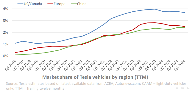 Tesla delivered 495,570 vehicles in Q4, marking a 2% increase YoY, and a new quarterly record. This was driven largely by the Model Y, which the company expects to be the best-selling vehicle worldwide in 2024. Total deliveries for the year reached 1,789,226, slightly below 2023 levels, leading to a relatively stable market share in major markets throughout the year.