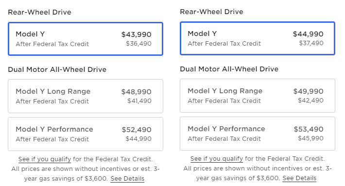According to an update to the Design Studio earlier today, the Model Y Rear-Wheel Drive (RWD) now starts at US$44,990, up from US$43,990 yesterday. The Long Range (LR) and Performance variants also got $1,000 price bumps, now starting at US49,990 and US$53,490 respectively.