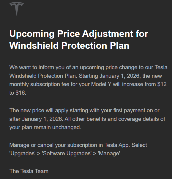 Tesla owners in the U.S. will soon have to pay a little more to protect one of the most vulnerable—and expensive—pieces of their vehicle. Beginning January 1, 2026, Tesla is increasing the monthly price of its Windshield Protection Plan for Model 3 and Model Y owners from $12 to $16, a 33% jump.