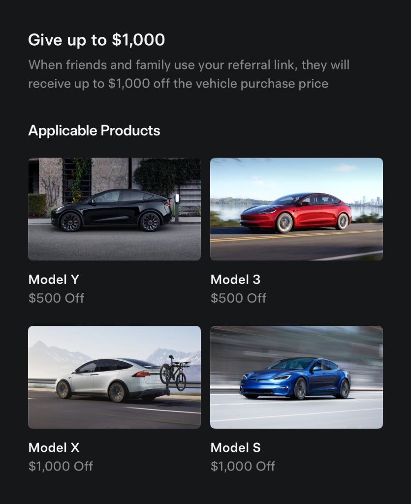 When Tesla relaunched their referral program back in August, they gave existing owners the opportunity to earn Tesla Credits when someone purchases a new car with their referral link. In exchange for using a referral link, the buyer would get a US$1,000 discount (C$1,300 in Canada) on their purchase of a Model S, Model 3, Model X, or Model Y.