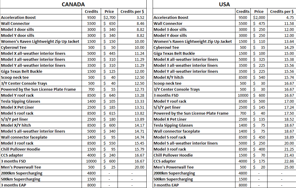 While it is a nice bonus, 100 credits won’t get you much. The “cheapest” reward you can redeem your credits for is a shirt or Model 3/Y Center Console Trays for 500 credits. Here is a list we compiled of all the awards in the Tesla Referral program, ranked from most to least cost effective (number of credits required per $).