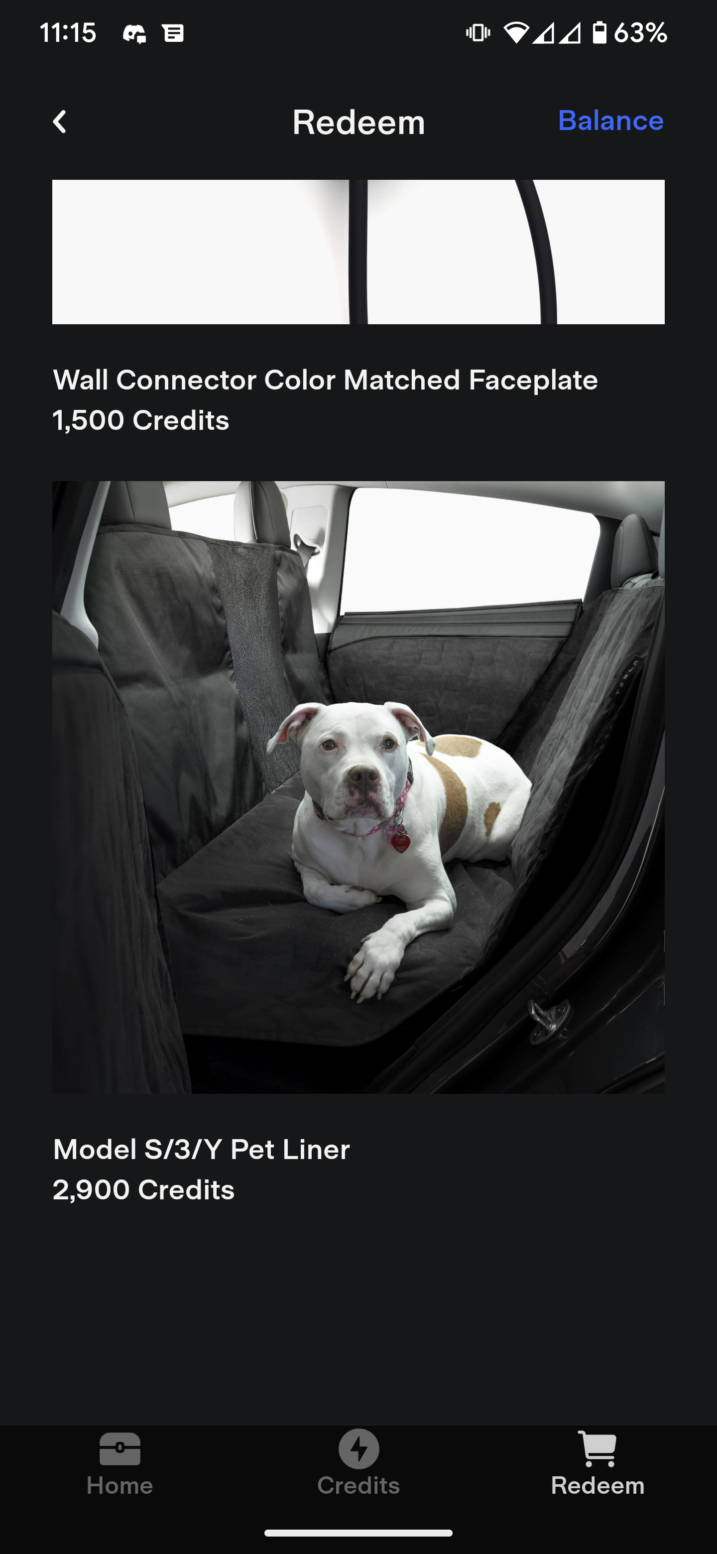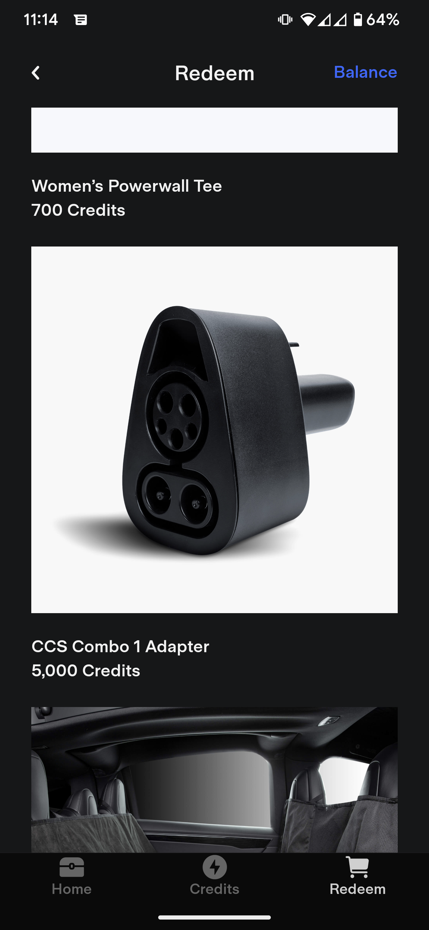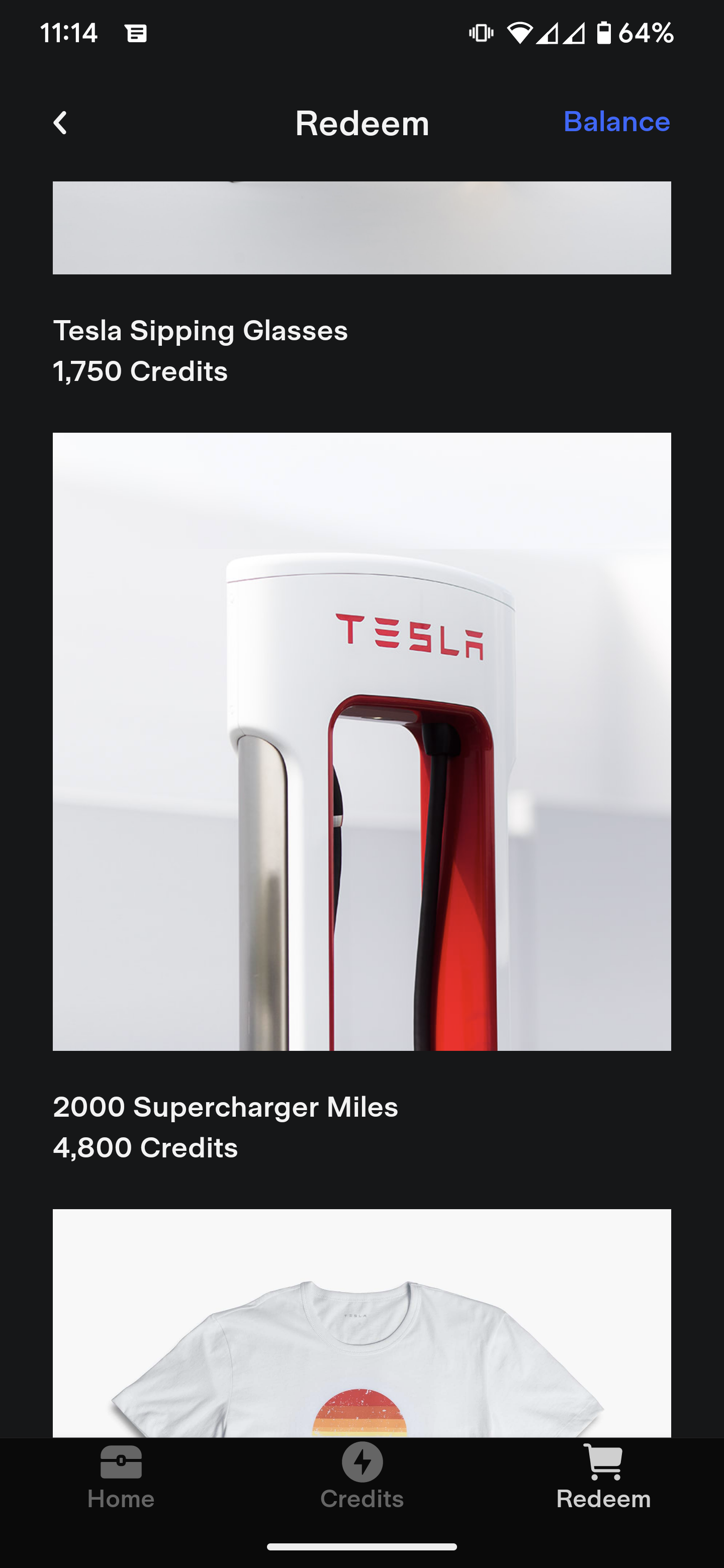 The redemption options appear to include almost all products found in the Tesla Shop, including the newly released Tesla Sipping Glasses (1,750 credits), CCS adapter (5,000 credits), Pet Liners (2,900 credits), clothing, and much more.