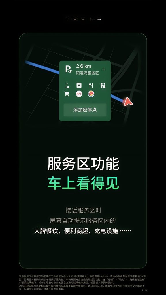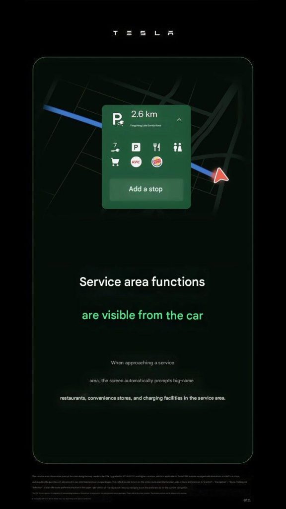 Another navigation-related feature introduced is Service Area Functions. A Service Area in China is a place along a highway that has shops, restrooms, and other amenities for drivers. Now when approaching one of these areas, an on-screen prompt will automatically appear, highlighting restaurants, convenience stores, and charging facilities in the service area.