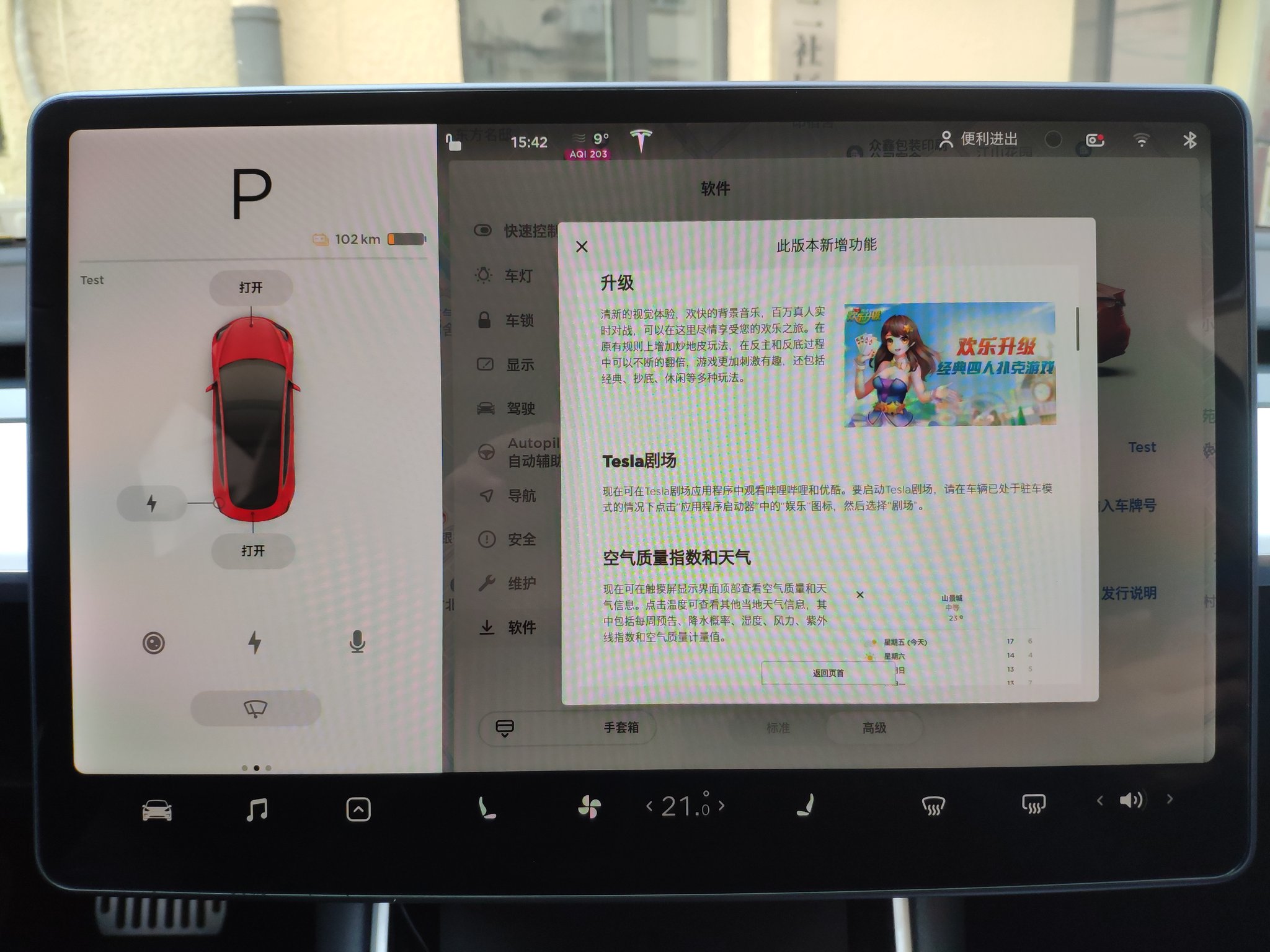 One interesting update includes the addition of air quality and weather information available on the in-car display. The existing temperature display on the screen is now interactive – you can touch it and view local weather information including forecasts, chance of rain, humidity, wind, UV index, and air quality.