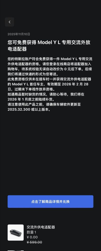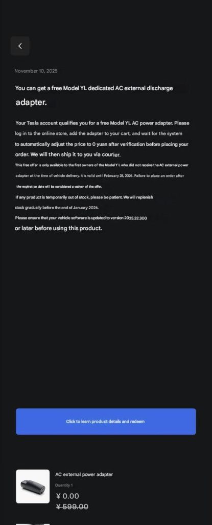 According to a notice sent to owners on November 10, 2025, Tesla accounts linked to qualifying Model Y L vehicles can log into the online store, add the adapter to their cart, and have the system automatically adjust the price to 0 yuan once ownership is verified. Tesla will then ship the adapter directly to customers by courier.