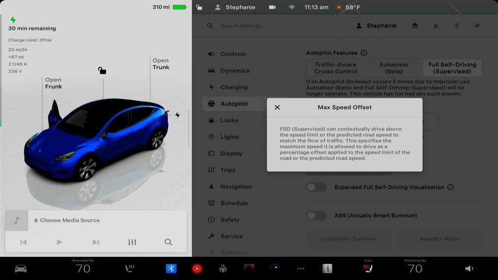 Also included with the new speed profiles is an update to Speed Offset, which has been renamed to Max Speed Offset. This option gives users the ability to decide how far above the speed limit you want FSD to drive to match the flow of traffic. You can set this in 5% increments, up to as much as +40%.