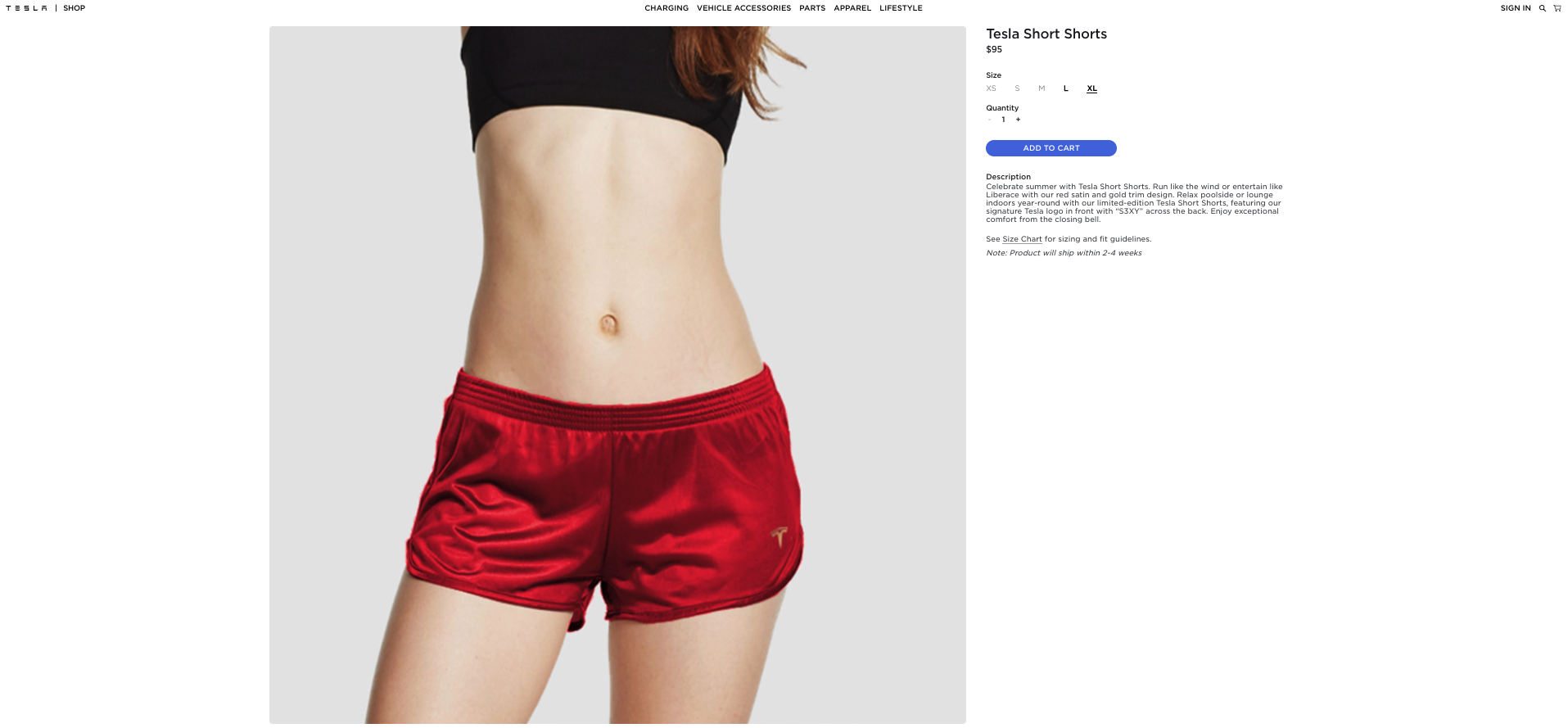 Celebrate summer with Tesla Short Shorts. Run like the wind or entertain like Liberace with our red satin and gold trim design. Relax poolside or lounge indoors year-round with our limited-edition Tesla Short Shorts, featuring our signature Tesla logo in front with “S3XY” across the back. Enjoy exceptional comfort from the closing bell.