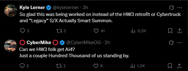 One Twitter user, Kyle Lerner (@kylelerner), wrote: “So glad this was being worked on instead of the HW3 retrofit or Cybertruck and ‘Legacy’ S/X Actually Smart Summon.” Another, CyberMikeOG, asked: “Can we HW3 folk get Ai4? Just a couple Hundred Thousand of us standing by.”