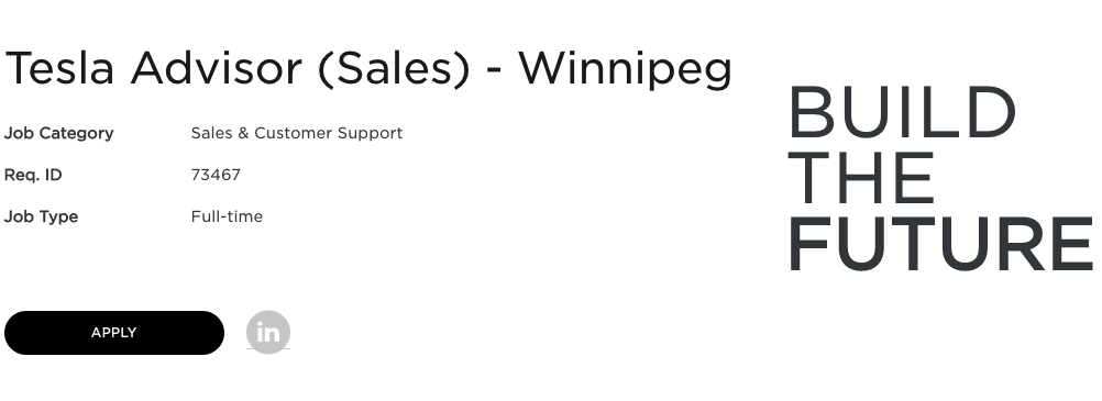 UPDATE: Good news for those in Manitoba, Tesla is also looking for Sales Advisors in Winnipeg.