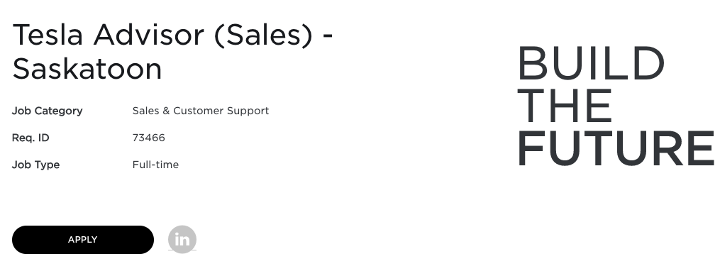 According to the posting, Tesla is looking for a Tesla Advisor (Sales) in Saskatoon. The successful candidate will “support customers from the moment they walk into our showrooms to learn about Tesla through to their delivery day experience.”