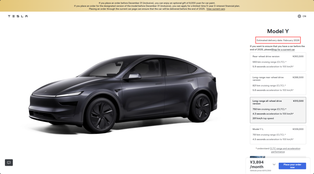 Tesla hasn’t offered such a guarantee yet, but its inventory strategy is clearly designed to help buyers secure 2025-eligible units. The automaker is also offering a free paint upgrade worth RMB 8,000, as well as 5-year 0% financing, for orders placed before December 31.
