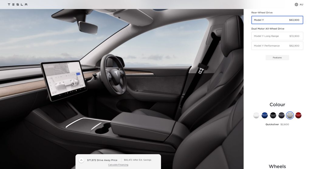 According to an update to the Design Studio on Thursday, all three variants dropped in price. The Model Y Rear-Wheel Drive (RWD) dropped by AUD$1,500, the Long Range (LR) by AUD$5,500, while the Performance variant saw the biggest price drop of AUD$8,500.