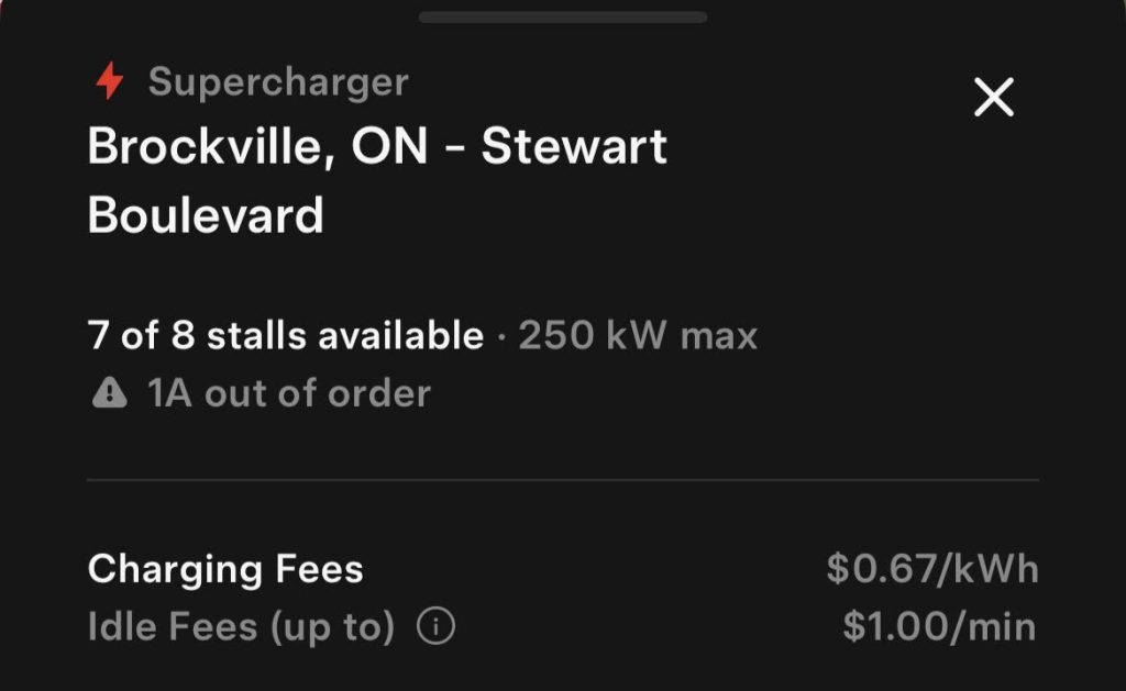 On the same day the Tesla share prices reached a new record high, the curse was finally lifted and the 8-stall V3 Brockville Supercharger is now open. According to the mobile app, it costs $0.67/kWh to plug in and charge.