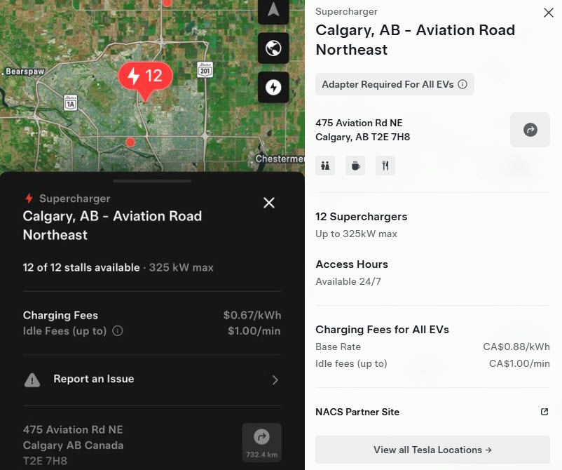 According to the mobile app and Tesla’s website, the new Calgary Supercharger costs $0.67/kWh for Tesla owners. This station is also accessible to non-Tesla owners, who will have to pay $0.88/kWh to plug in and charge with their North American Charging Standard (NACS) adapter, or opt for the $16.99/month non-Tesla Supercharging membership, which gives subscribers the same rate as Tesla owners.