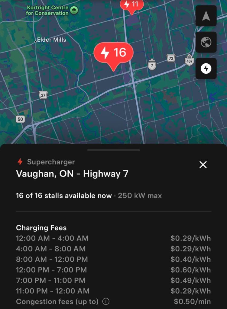 The Vaughan Supercharger offers off-peak and peak pricing throughout the day, ranging from a low of $0.29/kWh up to $0.60/kWh.