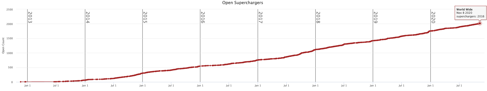 Just 8 years after installing the first Supercharger, Tesla has now surpassed 20,000 Superchargers stalls around the world.