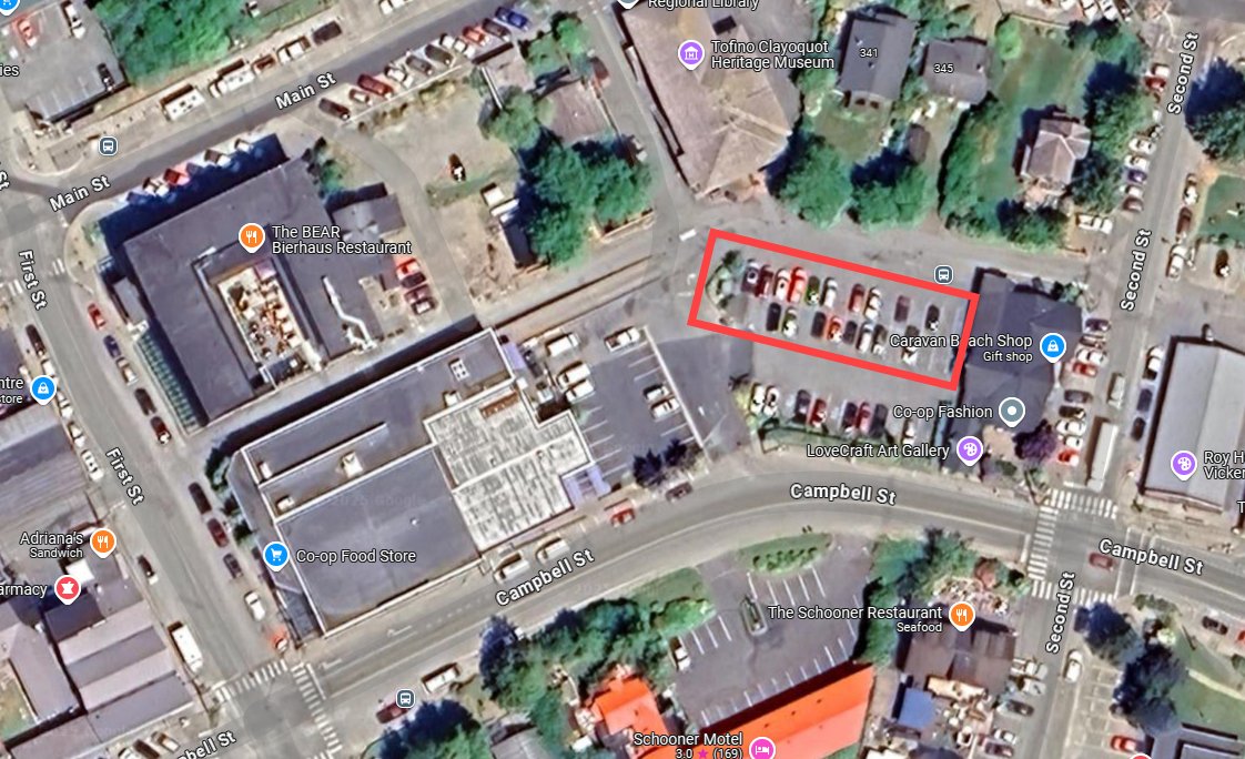 According to the poster, the site, located behind the CO-OP food store at the corner of First St. and Campbell St. in downtown Tofino, will actually feature 12 stalls. Based on the photo, we believe the map below indicates the location of the Supercharger station.