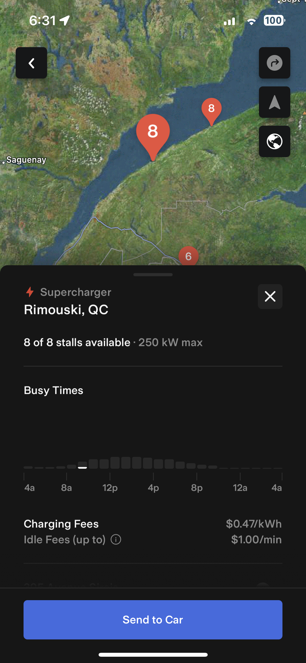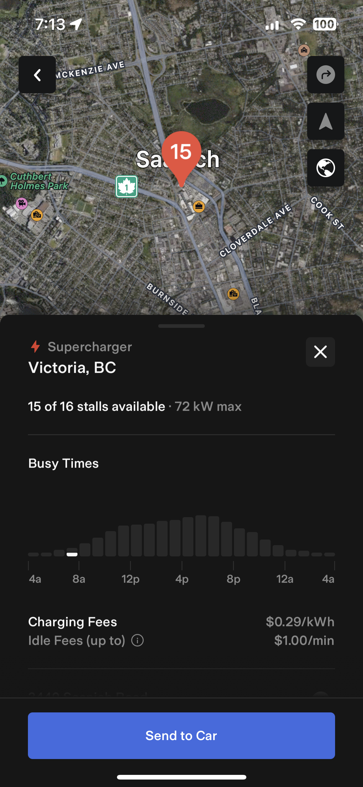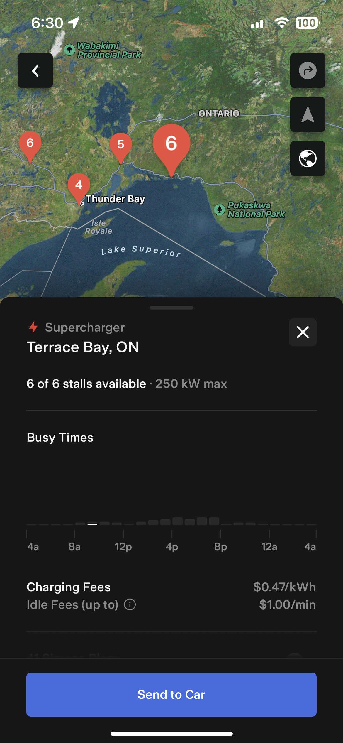 According to a review of rates by Drive Tesla, they appear to be consistent across the country. Urban Superchargers, which are the slowest 72kW, are also the cheapest at under $0.30/kWh. From there the rates increase to around $0.47 or $0.48 per kWh for V2 (150kW) and V3 (250kW) stations in all provinces. We were able to find some V2 stations that were outliers and also at less than $0.30/kWh, but most were at the higher rate. This is slightly more expensive than what Couche-Tard is billing ($0.39/kWh) at their 180kW stations.