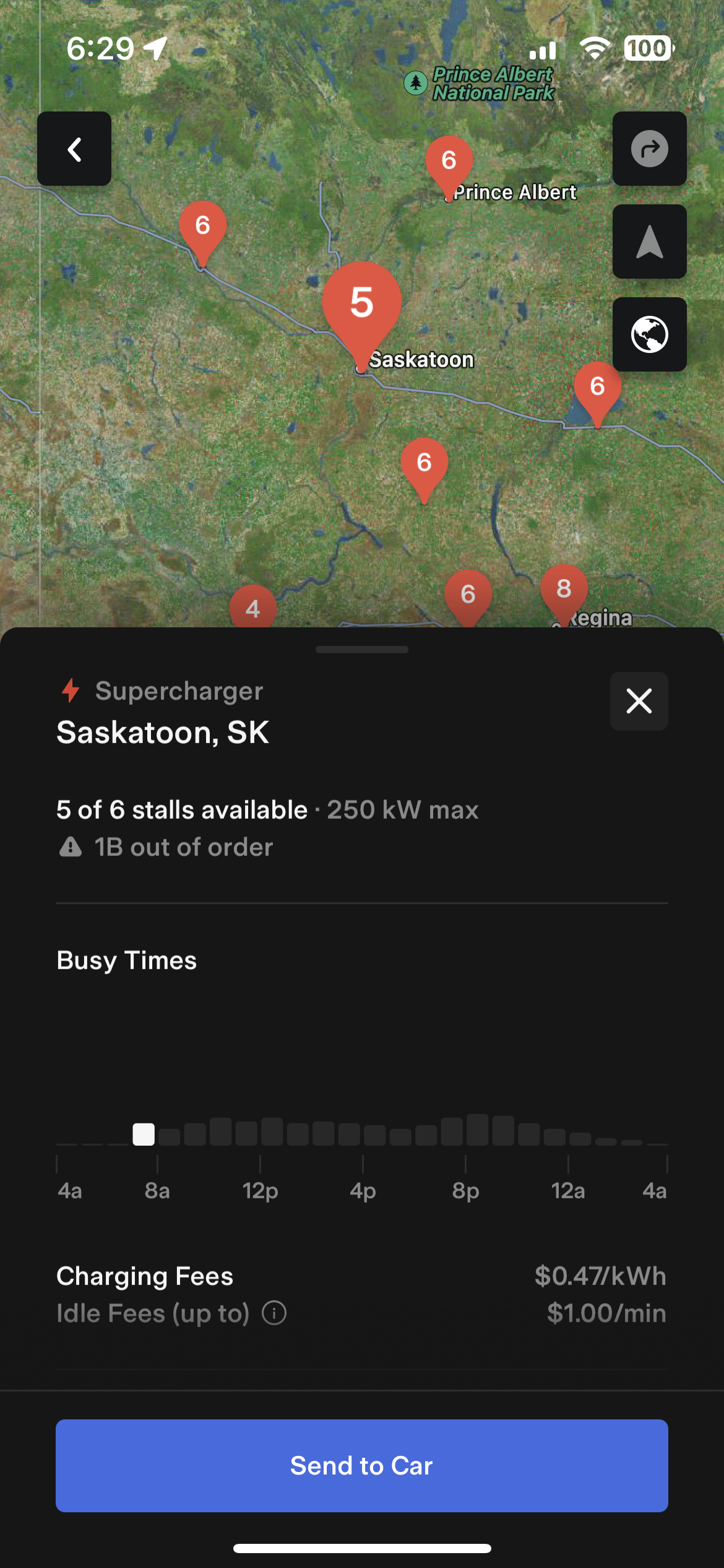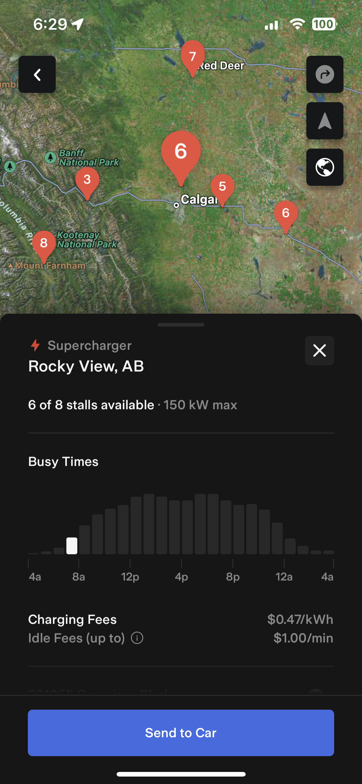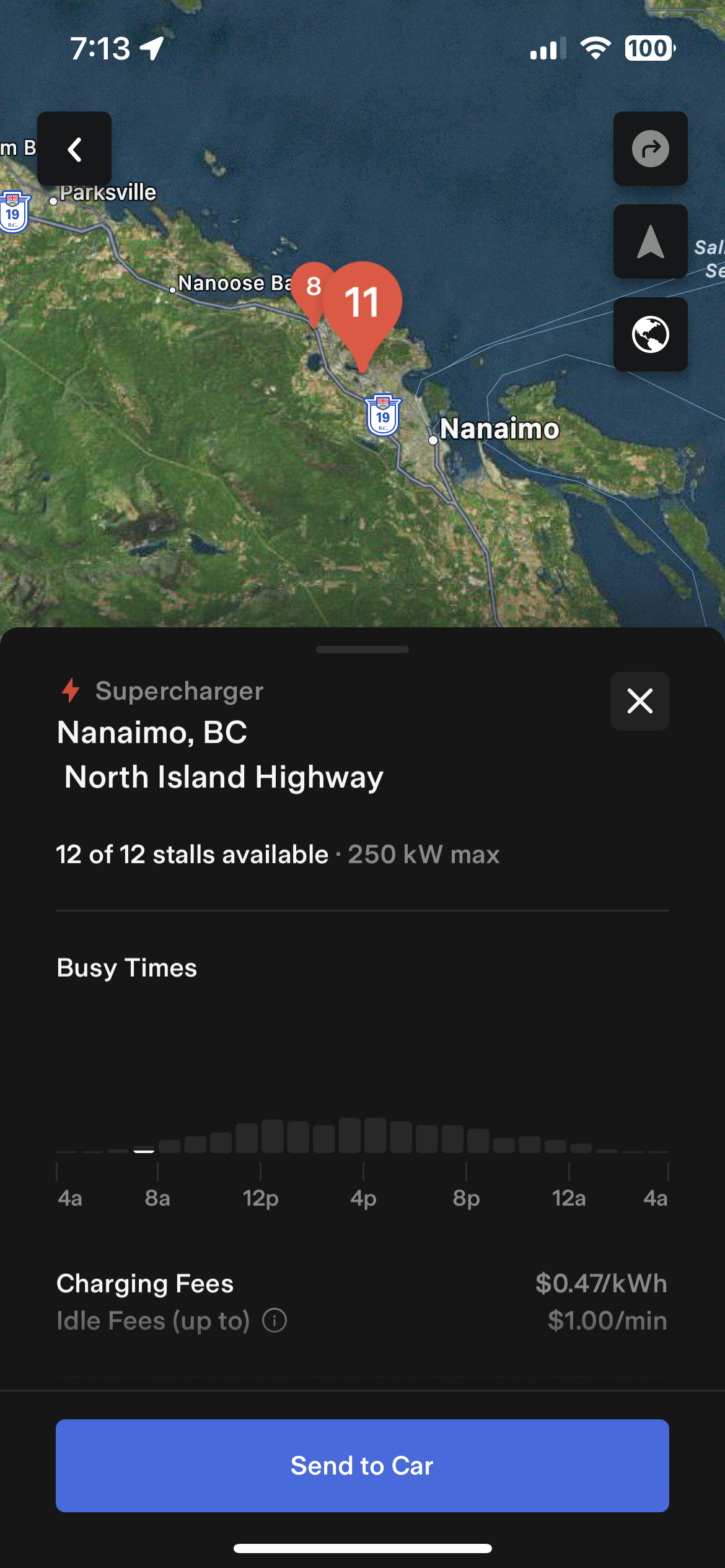 According to a review of rates by Drive Tesla, they appear to be consistent across the country. Urban Superchargers, which are the slowest 72kW, are also the cheapest at under $0.30/kWh. From there the rates increase to around $0.47 or $0.48 per kWh for V2 (150kW) and V3 (250kW) stations in all provinces. We were able to find some V2 stations that were outliers and also at less than $0.30/kWh, but most were at the higher rate. This is slightly more expensive than what Couche-Tard is billing ($0.39/kWh) at their 180kW stations.