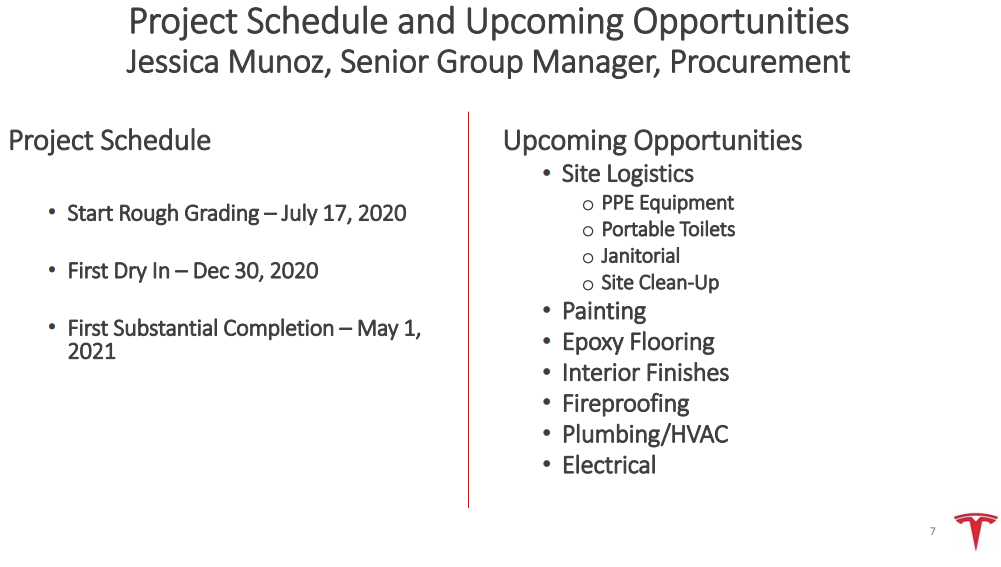 The document, titled “Travis County Colorado River Project Partner Pre‐Qualification Presentation”, also presents others milestone dates for Giga Texas, including “First Dry In” on December 30, 2020. If you’re wondering what that represents, dry in means the building shell will have been completed to a point where it can keep out the elements (wind, rain, etc.). It is at this point when interior work can begin.