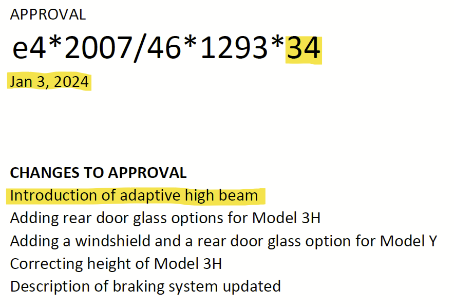 New certification documents in Europe show that on January 3, 2024 Tesla was approved to introduce adaptive high beams to the Model Y and the legacy Model 3. The documents were shared by Julien on X.