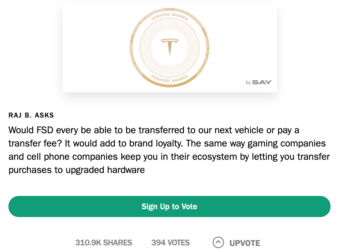 Tesla fan and shareholder Tesla_Raj posed this question for today’s Q3 2020 earnings call through Say. It spread rapidly on social media, and was able to garner enough shares and upvotes for it to be the third question asked during the call.