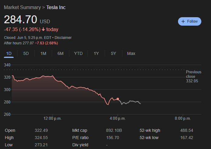 It didn’t take long for markets to react to the very public feud. Tesla shares had been climbing in recent weeks after Musk recommitted to leading the EV company full-time and announced a trial rollout of robotaxis in Austin, Texas. But Thursday’s drop erased many of those gains, with the stock closing at $278.40—down from $362 just on Tuesday. The downward trend continued in after-hours trading.
