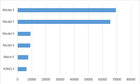 Close behind was the Model Y (65,355), followed by the Model X (9,214) and the Model S (8,960).