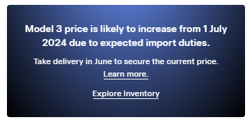 According to a message posted on Tesla’s Design Studio in Europe, the company says, “Model 3 price is likely to increase from 1 July 2024 due to expected import duties.”