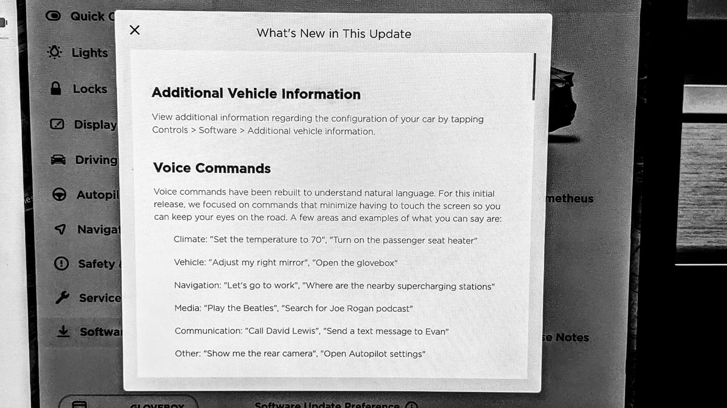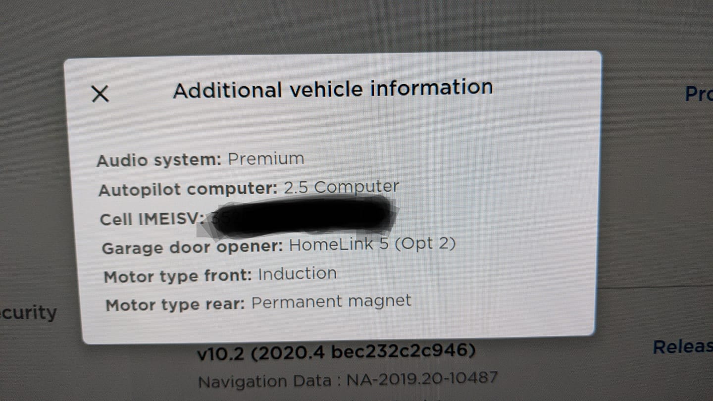 Most of the release notes are the same, with the exception of a new “Additional Vehicle Information” section. This new feature is a new menu option that, as its name implies, shows you more information about your specific vehicle. This includes audio system, cell IMEISV, garage door opener (i.e. HomeLink), and which types of motors your vehicle has in the front and rear. It also shows you which Autopilot computer you have onboard, either the HW2.5 computer, or the updated HW3.0 computer that allows you to see the FSD visualizations like traffic cones, traffic lights, lane markings, and more.