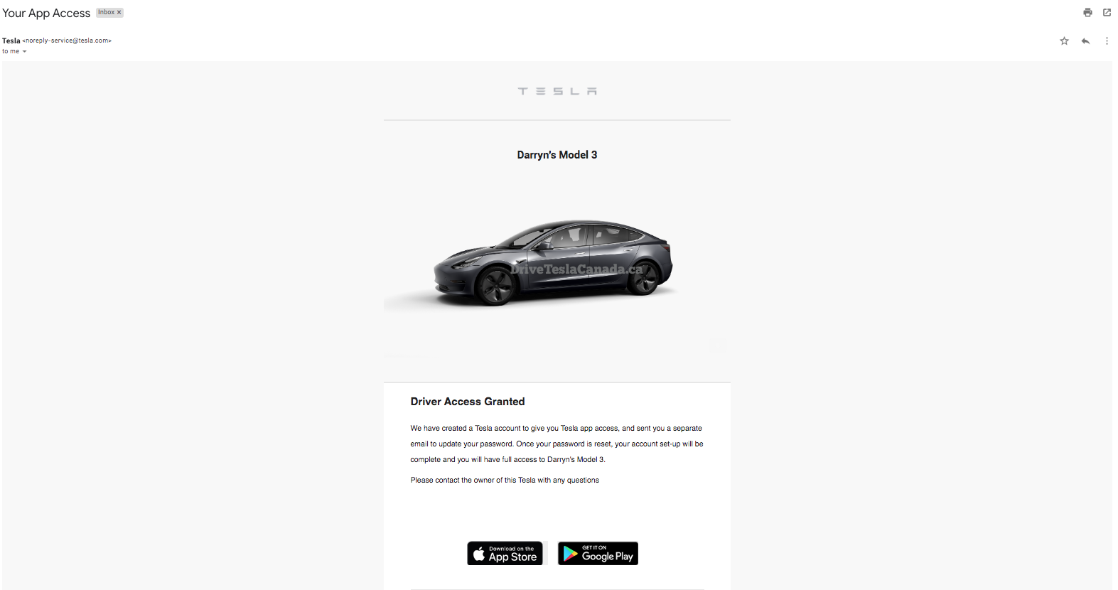 The first is an email notifying them of their new access with links to the Apple App Store and Google Play Store to download the Tesla mobile app. The second is an email with a link to set a new password for the account (click to enlarge).