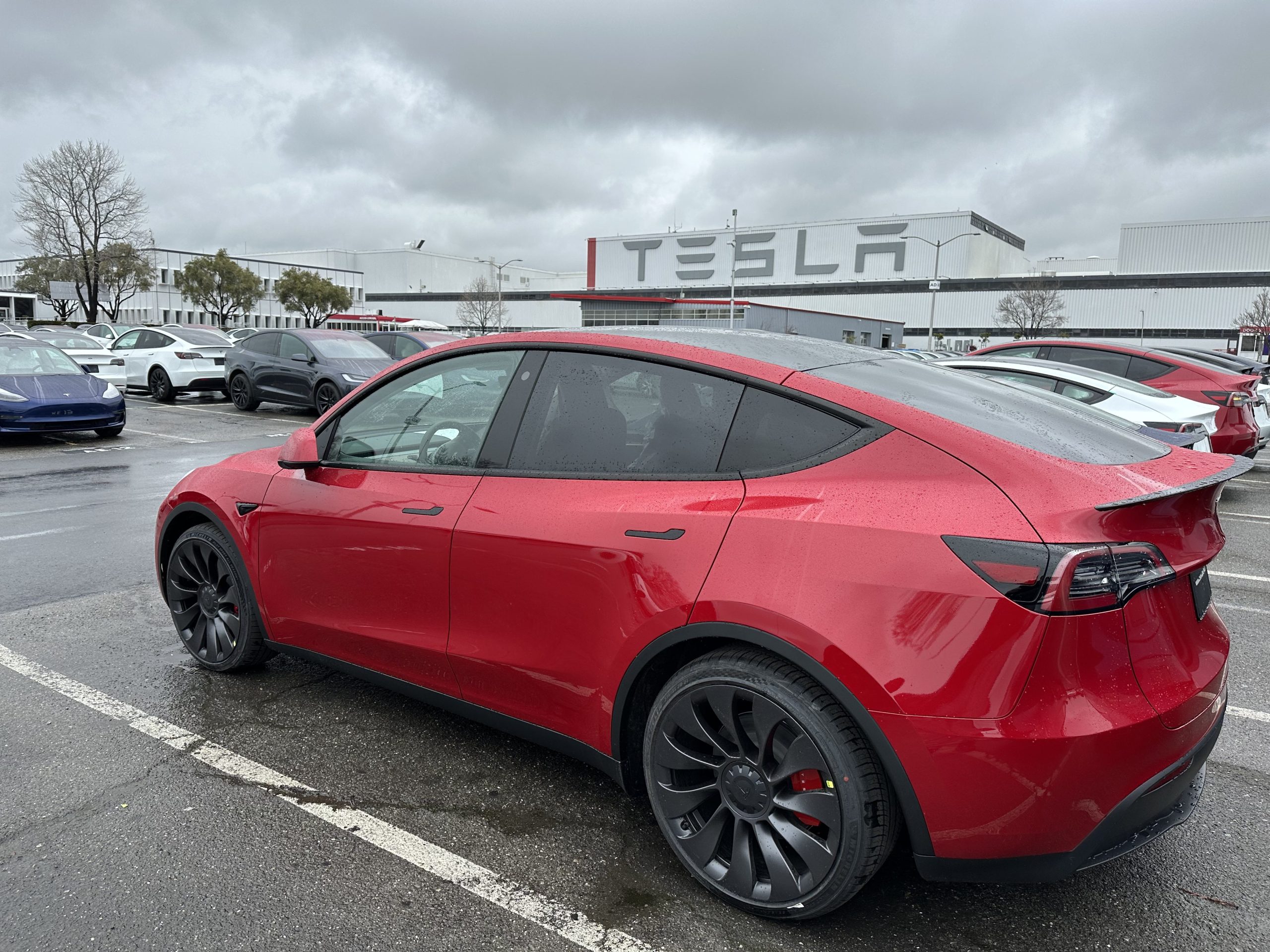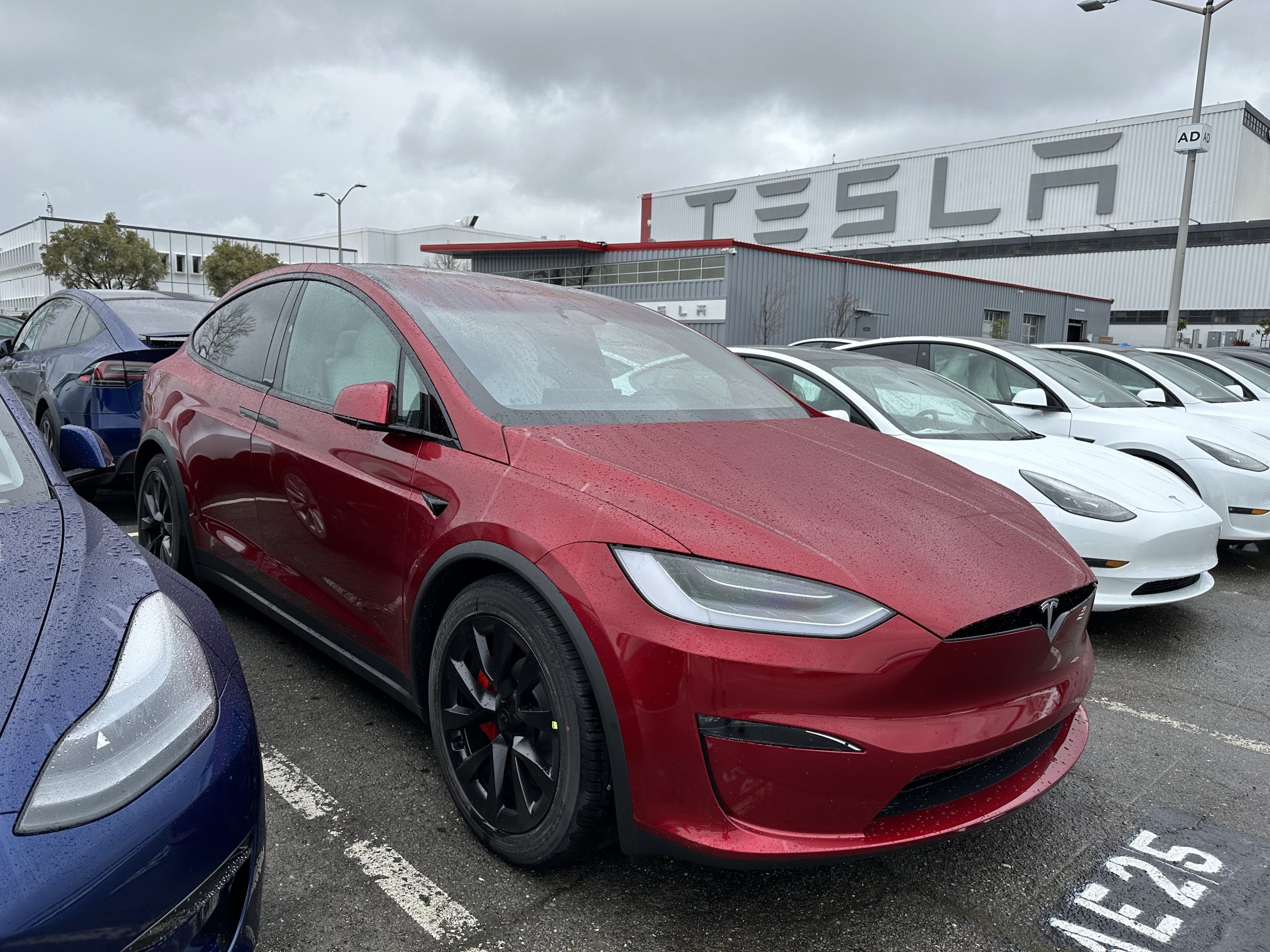 Always on the lookout for the newest Tesla, our friends over at The Kilowatts spotted a Model X finished in Ultra Red at the Fremont factory on Friday. The weather in the Bay Area was unfortunately overcast and rainy, which gave the Ultra Red colour a deeper, darker appearance that reminds us of Tesla’s Signature Red from the early days of the company.