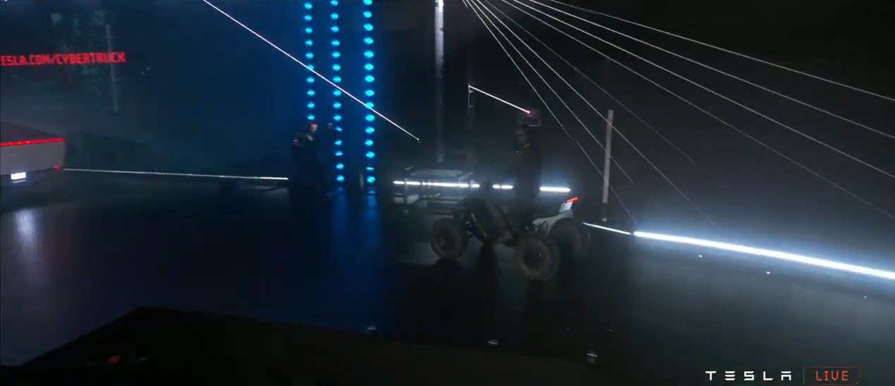 The electric ATV, dubbed Cyberquad, drove on stage, and was then promptly loaded into the Cybertruck Vault (aka truck bed). Once inside, the ATV was plugged into one of the built-in plugs in the Vault to charge.