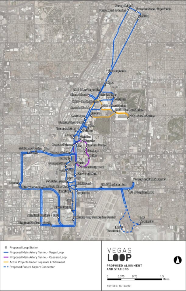 Last year TBC received unanimous approval to expand the Vegas Loop to 51 stops along approximately 34 miles (54km) of underground tunnels extending from Harry Reid International Airport through the Resort Corridor and up to the Fremont Street Experience. That would be a significant expansion from the less than 2 miles of tunnels and five stations that are currently operational under the Las Vegas Convention Centre (LVCC).