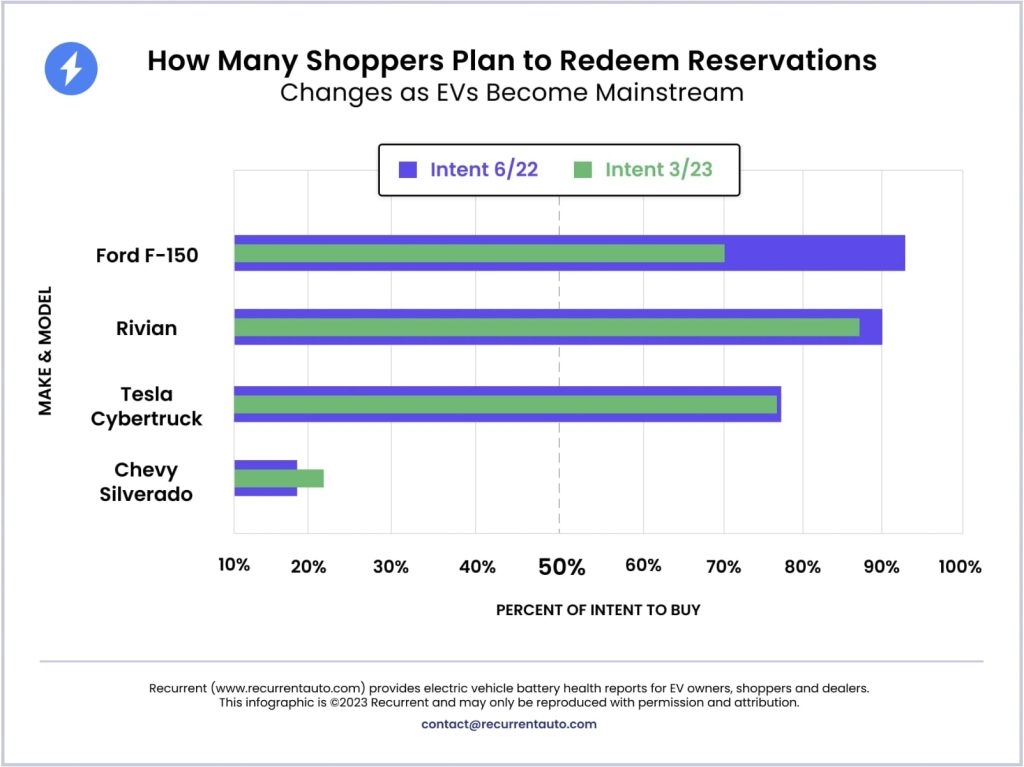 The Recurrent Auto survey took place in March 2023 and asked reservation holders of several different electric pickup trucks if they still intended to purchase the vehicle they had reserved. The company ran the same poll back in June 2022.