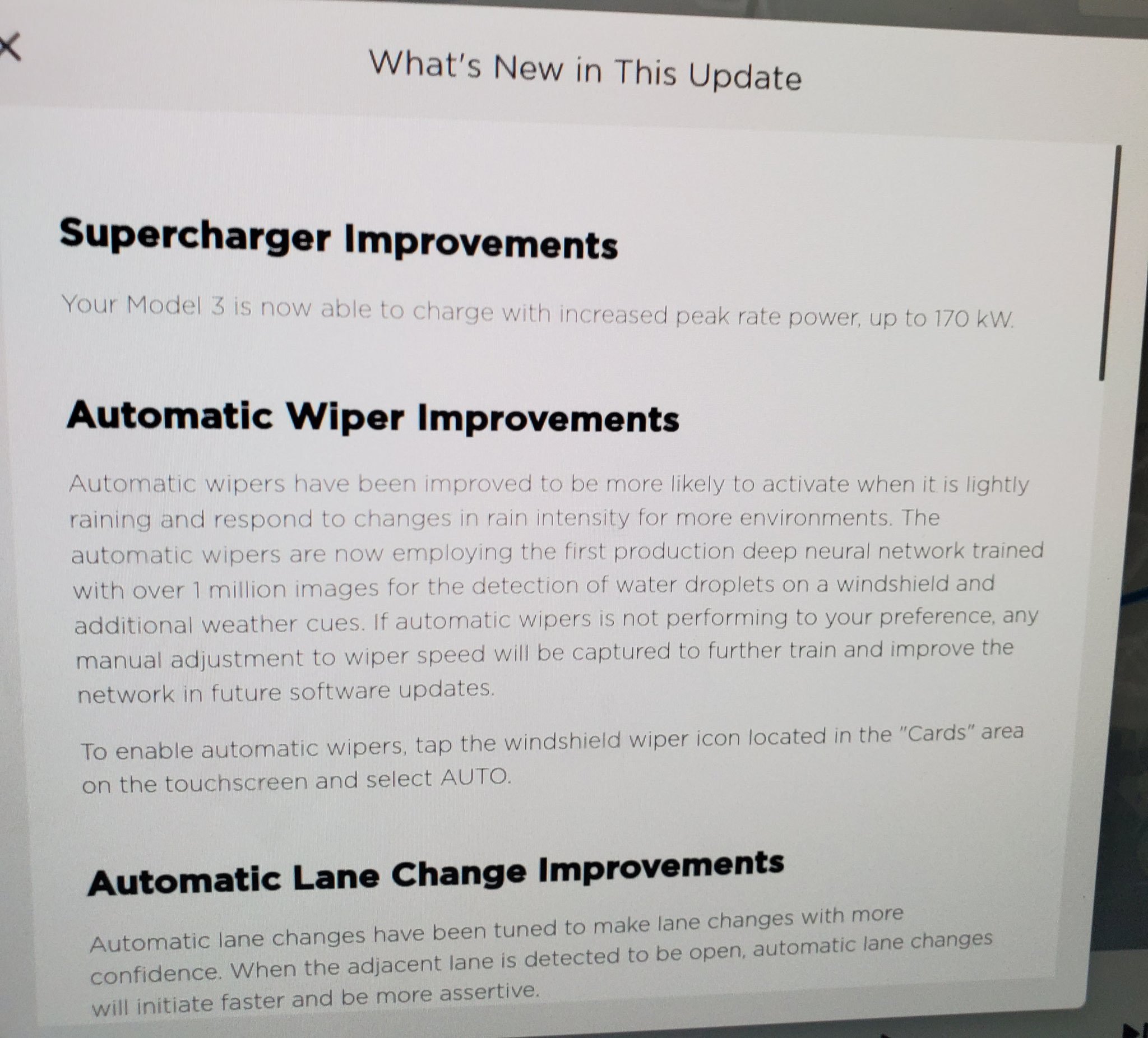The interesting feature of this update is the automatic wiper improvements. Many owners have complained about the wipers not reacting quickly enough to the changing weather conditions, forcing them to use them manually. Tesla CEO Elon Musk also recently elaborated on the development of their Deep Rain neural net, which now appears set to be released.