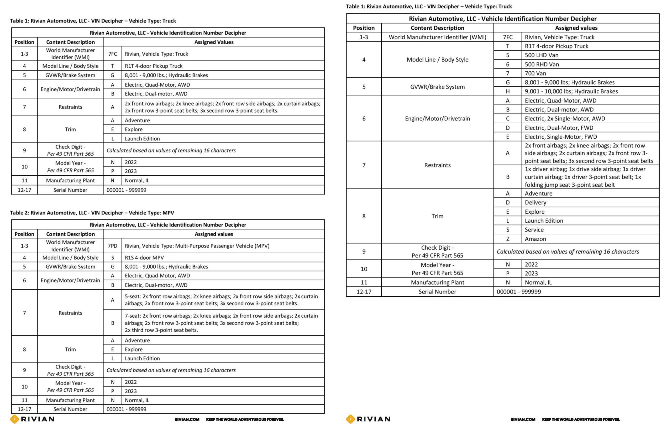 A VIN (vehicle identification number) document filed with the U.S. National Highway Traffic Safety Administration (NHTSA) has revealed that Rivian has gone with a simple naming convention for the Amazon delivery van.