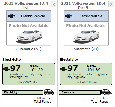 The ratings also reveal the efficiency for what VW calls their most important vehicle in years. In highway driving, both versions of the ID.4 get 89MPGe, or the equivalent of 235 Wh/km (379Wh/mi). City driving obviously fares better, getting 104MPGe, or 201 Wh/km (324 Wh/mi).