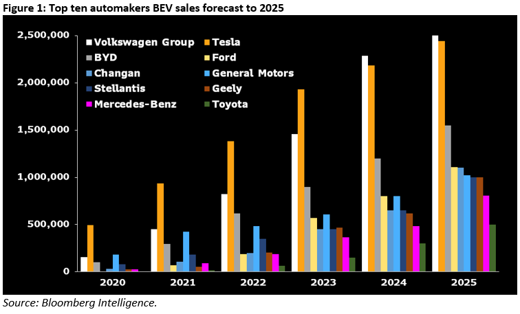 VW and Tesla will be in a league of their according to the report, with the next closest competitor, China’s BYD about 1 million units behind.