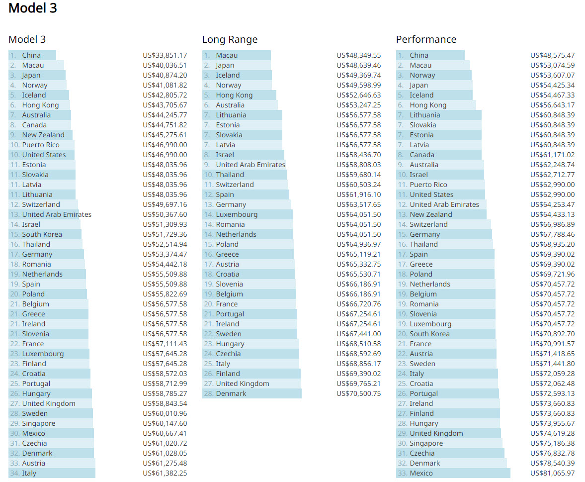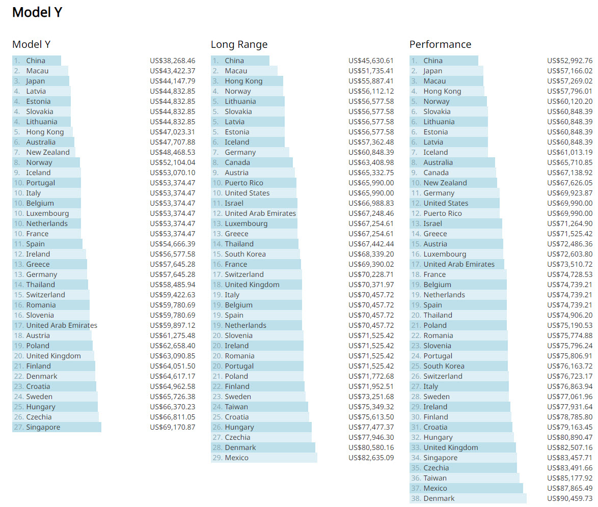 The results are quite similar for the Model Y. China takes the top spot for all three variants of the electric SUV – RWD, Long Range, and Performance, by as much as $6,000.