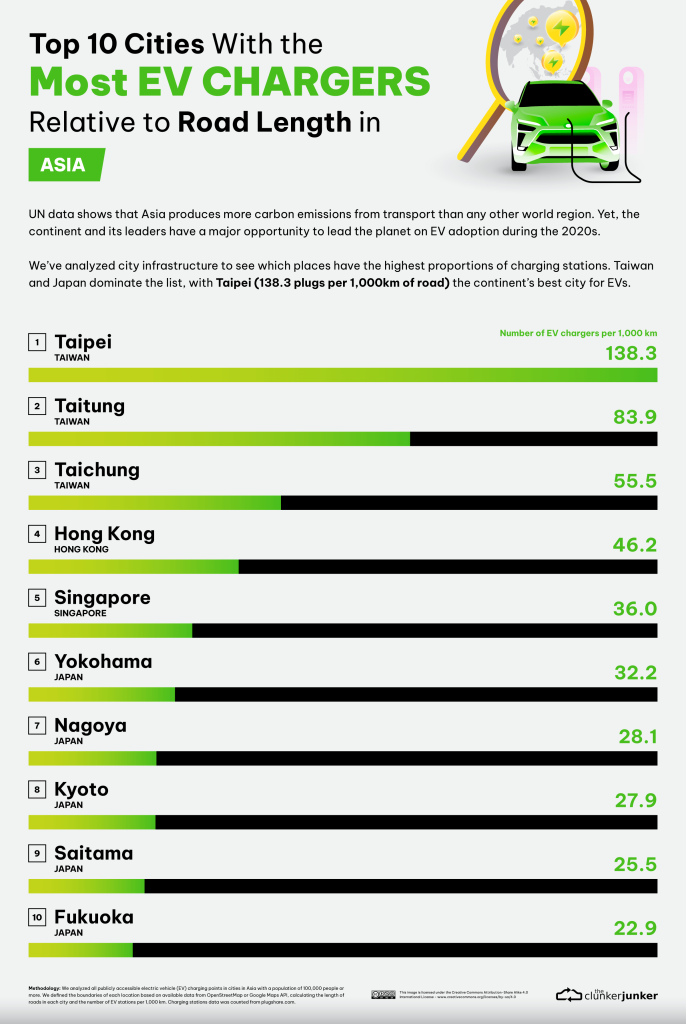 The report is truly global, with numbers from across the world. One of the big things to us was that Mainland China, excluding Hong Kong, does not have a single city in the top ten for Asia. Taiwan and Japan are dominating in terms of EV infrastructure.