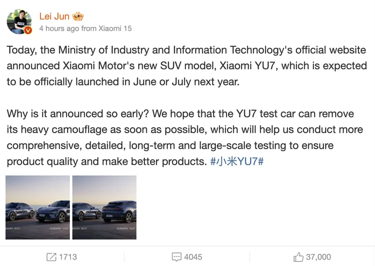 According to Jun, the YU7 could be officially launched in June or July next year. The Xiaomi boss indicated the car would soon start extensive testing, which was why it was revealed so early.