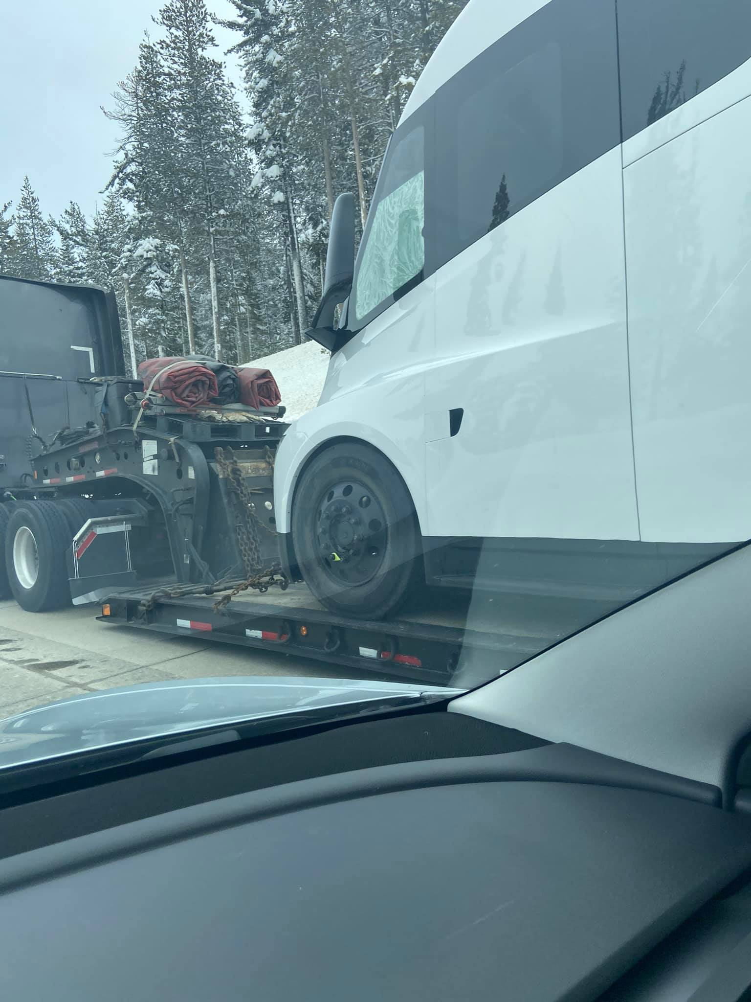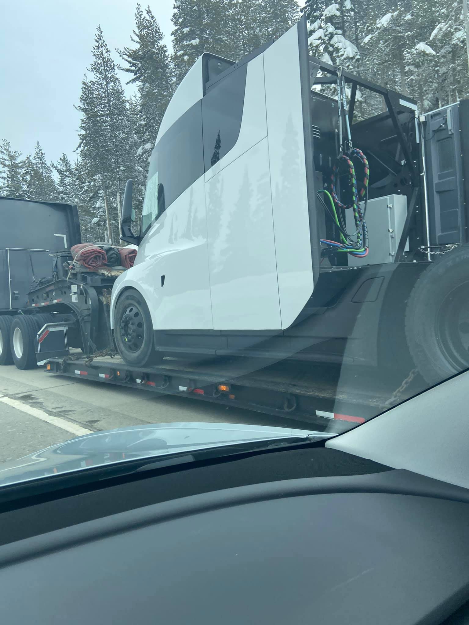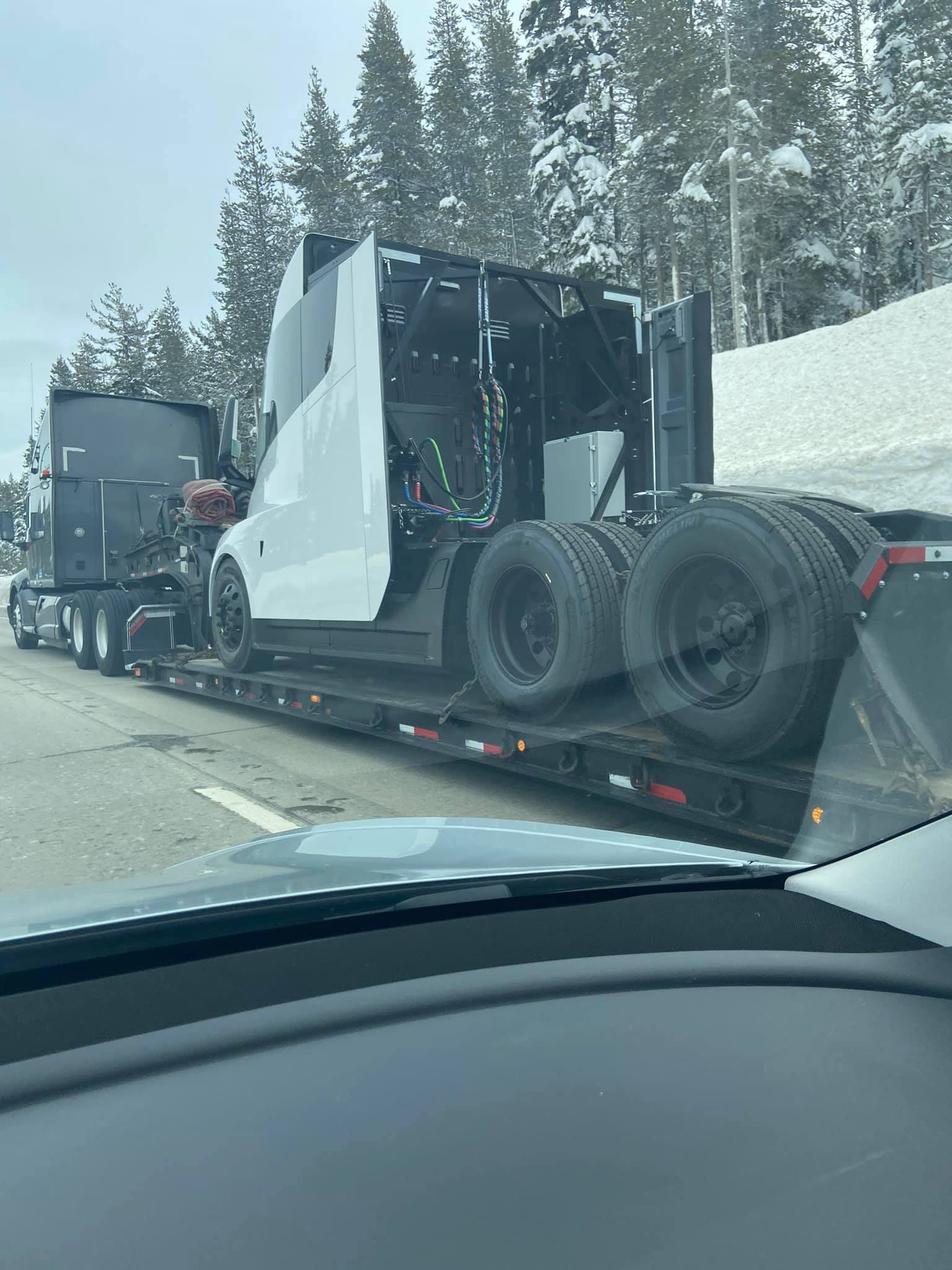 Now another build of the newly designed Semi has been spotted heading east on Interstate 80 near Truckee, California. The photos, taken by Jerome Mends-Cole II and shared to Twitter by Tesla Owners NorCal-Reno, give us a up-close look at some details showing it is a different truck than previously seen by The Kilowatts.