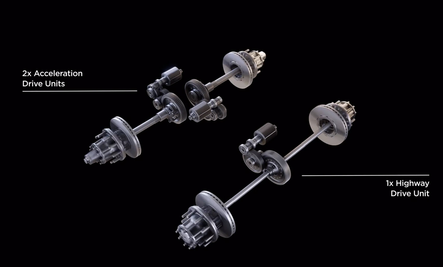 Powering the Semi is a tri-motor drivetrain, with one of those motors used specifically to maximize efficiency by only using it at cruising speeds. The other two motors kick in for added torque and acceleration, like when driving up a grade.